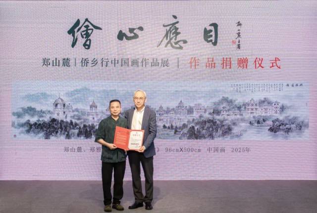 本次展览活动得到开云电竞官方网站政协书画院的大力支持,为了表达对支持单位的由衷感谢和真诚祝福,郑先生特地创作了国画作品《小鸟天堂》,无偿捐赠给开云电竞官方网站政协书画院。周文秘书长为郑山麓先生颁发收藏证书,并回赠《江门五邑籍书画名家作品集》给郑山麓先生并合影留念。