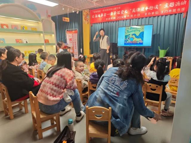 绘本故事会在温馨的氛围中拉开帷幕。志愿者老师以生动活泼的语言和丰富的表情,将小朋友们带入了 Maisy 的世界。《Maisy's Thanksgiving》讲述了可爱的小老鼠 Maisy 和她的朋友们一起庆祝感恩节的故事。在故事中,孩子们跟随着 Maisy 一起准备感恩节大餐、装饰房间、分享快乐,感受着感恩的力量。