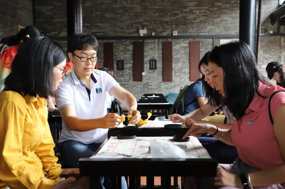 在陈白沙祠贞节堂,拓印活动也在同步进行中,工作人员们详细地为在场的游客们讲解和示范拓印的操作步骤,并指导游客们亲身体验拓印的乐趣。另一边,举行了投壶体验活动。不管是大人还是小孩,对于该项已有千年历史的传统趣味活动都十分感兴趣。在崇正堂,开展了榫卯拼砌体验活动,现场设有榫卯结构模型供游客观察和拼装体验。现场还设有多个“鲁班锁”供游客们把玩,体验榫卯结构魅力和我国工匠的智慧。
