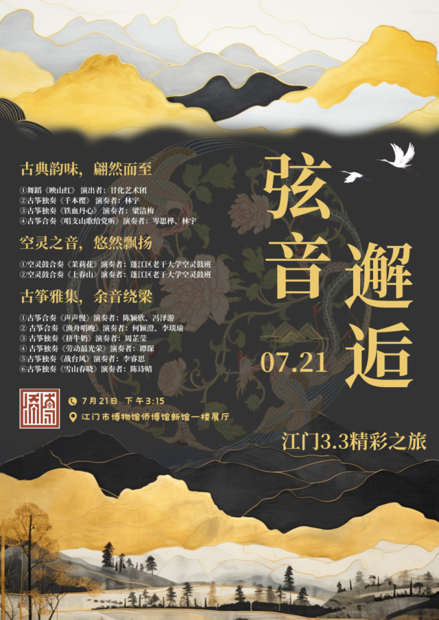 7月21日下午3:15,侨博馆即将举办一场别具一格的艺术盛宴——“古风Live3.3快闪”活动。在这个特别的时刻,侨博馆一楼展厅将化身为一座国风音乐的艺术殿堂,引领我们领略乐韵与舞蹈的绝美交响,沉浸于那份深沉而又优雅的文化底蕴中。