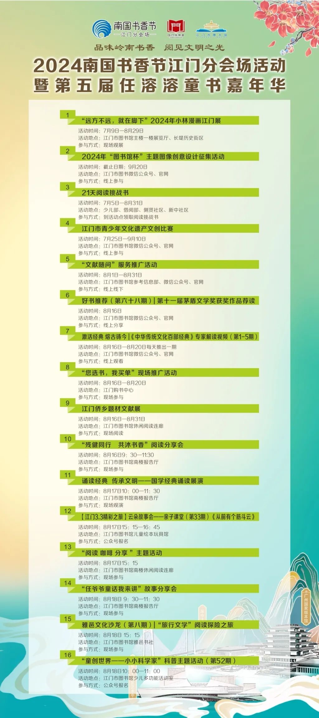 品味岭南书香,阅见文明之光。2024南国书香节将于8月16日—20日在全省拉开帷幕。为发挥南国书香节倡导全民阅读、以文化人、惠民利民的作用,满足人民群众精神文化需求,大力营造“爱读书、读好书、善读书”的全民阅读浓厚氛围,开云电竞官方网站图书馆为市民读者准备了主题鲜明、内容丰富、形式多样的文化活动,诚邀各位读者一起与书为伴,品味书香!