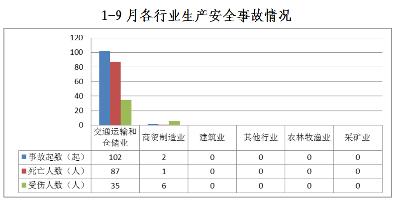 1-9月,全市共发生生产安全事故104起,其中交通运输和仓储业102起、占98%;商贸制造业2起、占2%;农林牧渔业、采矿业、建筑业和其他行业未发生生产安全事故。