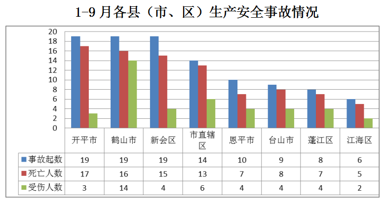 1-9月,开平市发生交通运输和仓储业事故19起;鹤山市发生交通运输和仓储业事故19起(其中商贸制造业事故1起、交通运输和仓储业事故18起);新会区发生交通运输和仓储业事故19起;市直辖区发生事故14起(其中道路运输事故11起、水上运输事故3起);恩平市发生交通运输和仓储业事故10起;台山市发生事故9起(其中商贸制造业事故1起、交通运输和仓储业事故8起);蓬江区发生交通运输和仓储业事故8起;江海区发生交通运输和仓储业事故6起。