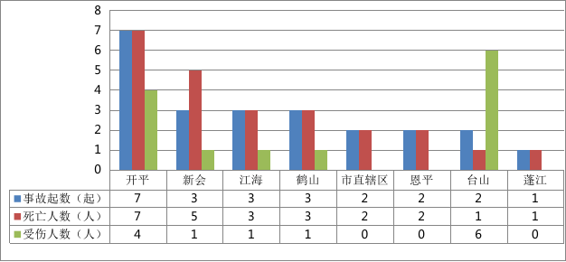 开平事故7起,新会事故3起,江海事故3起,鹤山事故3起,市直辖区1事故2起,恩平事故2起,台山事故2起,蓬江事故1起。