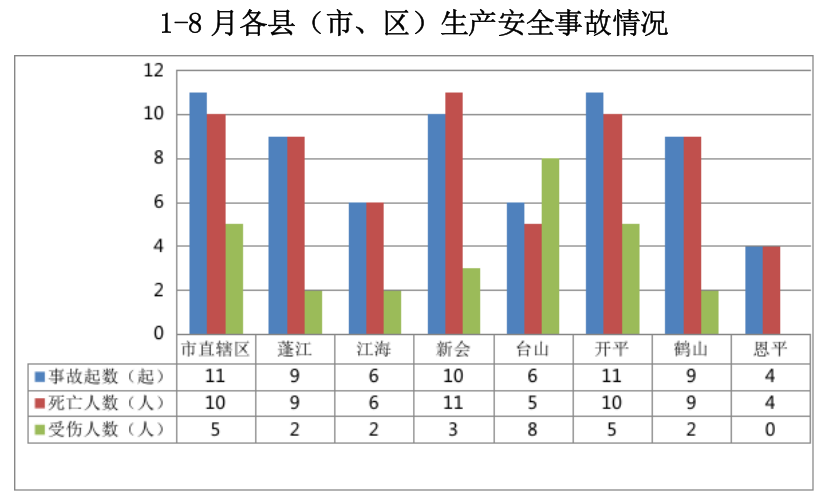 市直辖区事故11起,蓬江事故9起,江海事故6起(均为道路运输),新会事故10起,台山事故6起,开平事故11起,鹤山事故9起,恩平事故4起。