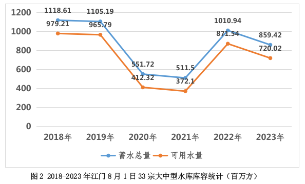 表22018-2023年江门8月1日33宗大中型水库库容统计(百万方)
