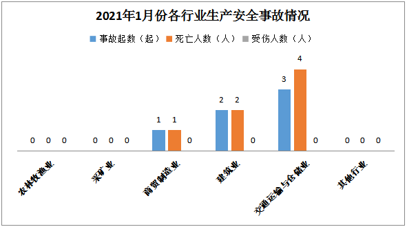 1月,全市共发生生产安全事故6起,其中商贸制造业1起,占17%;建筑业2起,占33%;交通运输和仓储业3起,占50%。