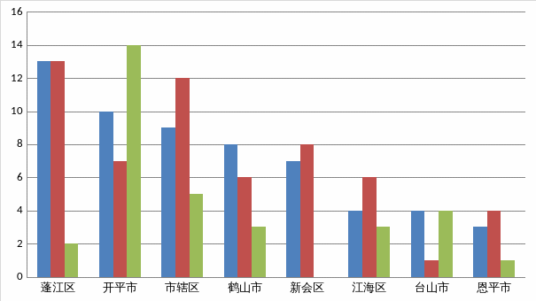 市辖区1发生事故9起(其中道路运输事故6起、水上运输事故2起、其他行业2事故1起);蓬江区发生事故13起(其中商贸制造业事故2起、建筑业事故3起、交通运输和仓储业事故7起、其他行业事故1起);江海区发生事故4起(其中建筑业事故1起、交通运输和仓储事故业3起);新会区发生事故7起(其中农林牧渔业事故1起、商贸制造业事故3起、建筑业事故1起、交通运输和仓储业事故1起、其他行业事故1起);台山市发生事故4起(其中农林牧渔业事故1起、商贸制造业事故1起、交通运输和仓储业事故2起);开平市发生事故10起(其中商贸制造业事故1起、交通运输和仓储业事故9起);鹤山市发生事故8起(其中商贸制造业事故3起、建筑业事故1起、交通运输和仓储业事故4起);恩平市发生事故3起(其中商贸制造业事故1起、交通运输和仓储业事故2起)。