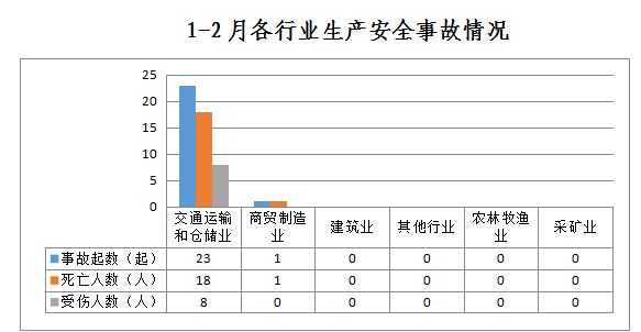 1-2月,全市共发生生产安全事故24起,其中交通运输和仓储业23起、占96%;商贸制造业1起,占4%;农林牧渔业、采矿业、建筑业和其他行业未发生生产安全事故。