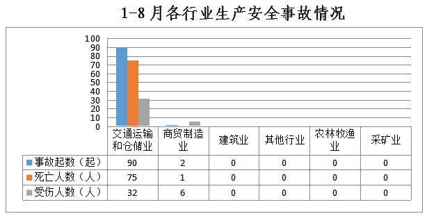 1-8月,全市共发生生产安全事故92起,其中交通运输和仓储业90起、占98%;商贸制造业2起、占2%;农林牧渔业、采矿业、建筑业和其他行业未发生生产安全事故。
