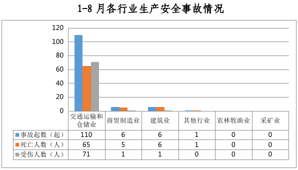 全市共发生生产安全事故123起,其中交通运输和仓储业110起、占89%,商贸制造业6起、占5%,建筑业6起、占5%,其他行业1起、占1%。农林牧渔业和采矿业未发生生产安全事故。