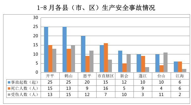全市发生生产安全事故123起:开平25起, 鹤山25起,恩平20起,市直辖区15起,新会12起,蓬江10起,台山10起,江海6起。