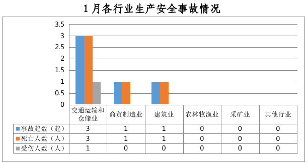 全市共发生生产安全事故5起,其中交通运输和仓储业3起,占60%;商贸制造业1起、占20%;建筑业1起、占20%。农林牧渔业、采矿业和其他行业未发生生产安全事故。