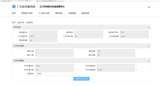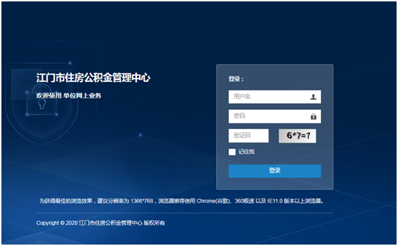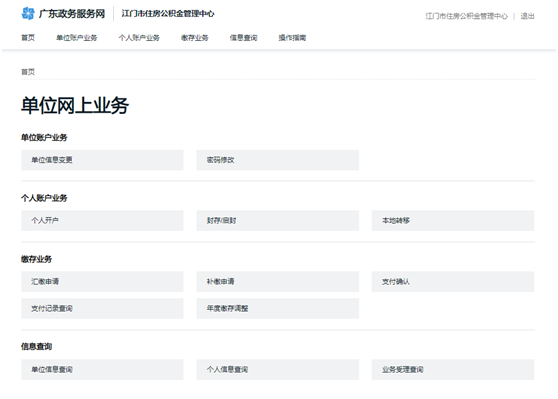 单位经办人登录http://jmgjj.jiangmen.cn:20624/wsyw,输入用户名、密码和验证码后,点击“登录”,就可以进入单位网上业务主页面,经办人可以根据自己单位的需要,进行相关业务操作。