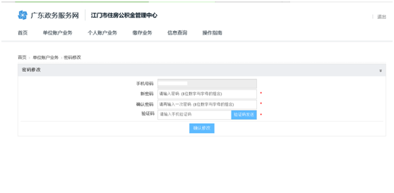 进入页面,录入新密码以及确认密码,通过手机验证码校验通过后,点击“确认修改”按钮,提交成功,则密码修改成功。