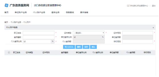 (1)录入字段:证件类型(下拉选框:身份证、护照、港澳通行证、台胞证、外国人居住证、军官证、其他)、缴存基数、个人比例;单位比例、单位缴存额、个人缴存额自动带入。