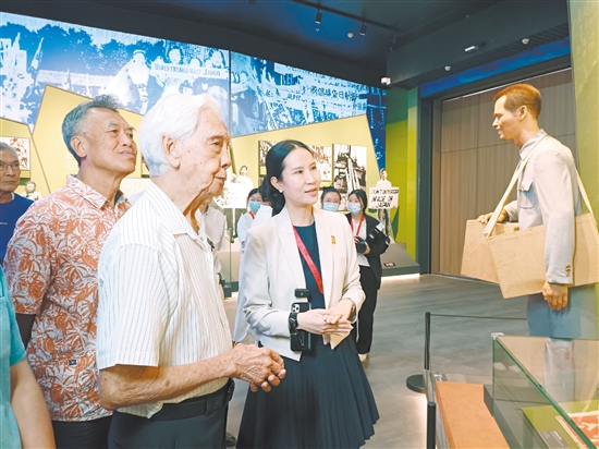 6月20日上午,爱国华侨郑潮炯第二子、新加坡侨领代表郑社心先生,郑潮炯之孙赵卫国(郑潮炯送养他人的四子郑社义的儿子)等参观中国侨都华侨华人博物馆(以下简称“侨博馆”)。当来到父亲郑潮炯事迹展示处,89岁高龄的郑社心先生驻足良久,深情表达对父亲的崇敬缅怀之情。