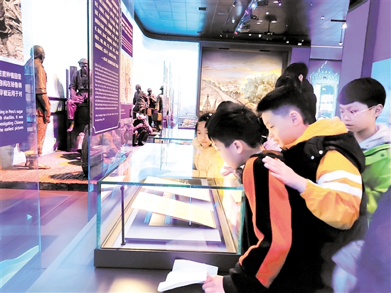 寒假期间,不少学生到侨博馆参观。图为孩子们驻足观看“蔡亚华受聘为赴哈瓦那跟船医生的合同”。