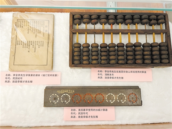 “这是李振才的父辈在美国旧金山衣馆使用的,那时他们做生意时还是使用中国带去的算盘来算账。”李柏达介绍,早期在美国务工的华侨往往只能做美国人不愿意做的煮菜工、洗衣工,起早贪黑、不分昼夜地干活,只为赚取一点点辛苦费。“但华侨都有着坚毅的品格,最终靠着自身的勤奋与智慧,逐渐在美国乃至世界各地站稳了脚跟。”李柏达说。