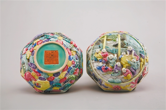 粉彩八角九子瓷印盒由开平籍爱国侨领周锐捐赠。