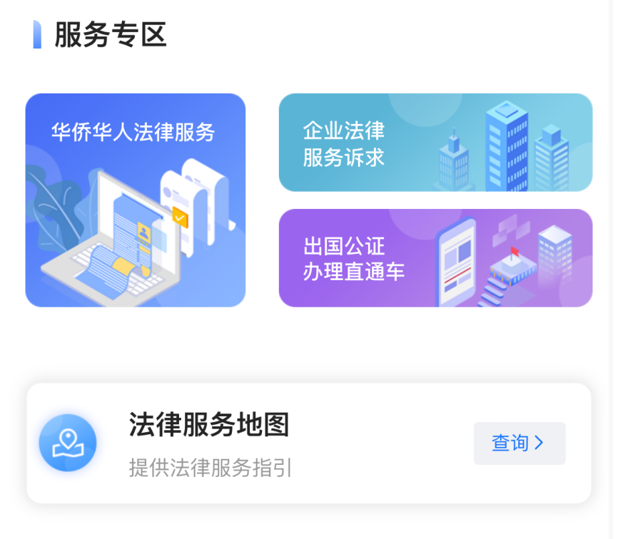 1.华侨华人法律服务专区提供涉侨法律咨询服务、公证办理、诉讼代理、出国回国指南等业务事项,实现涉侨公共法律服务“掌上办”。专区还配备了“江门涉外法律服务地图”小程序,提供简体中文、繁体中文、英语三种语言服务。